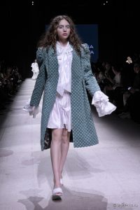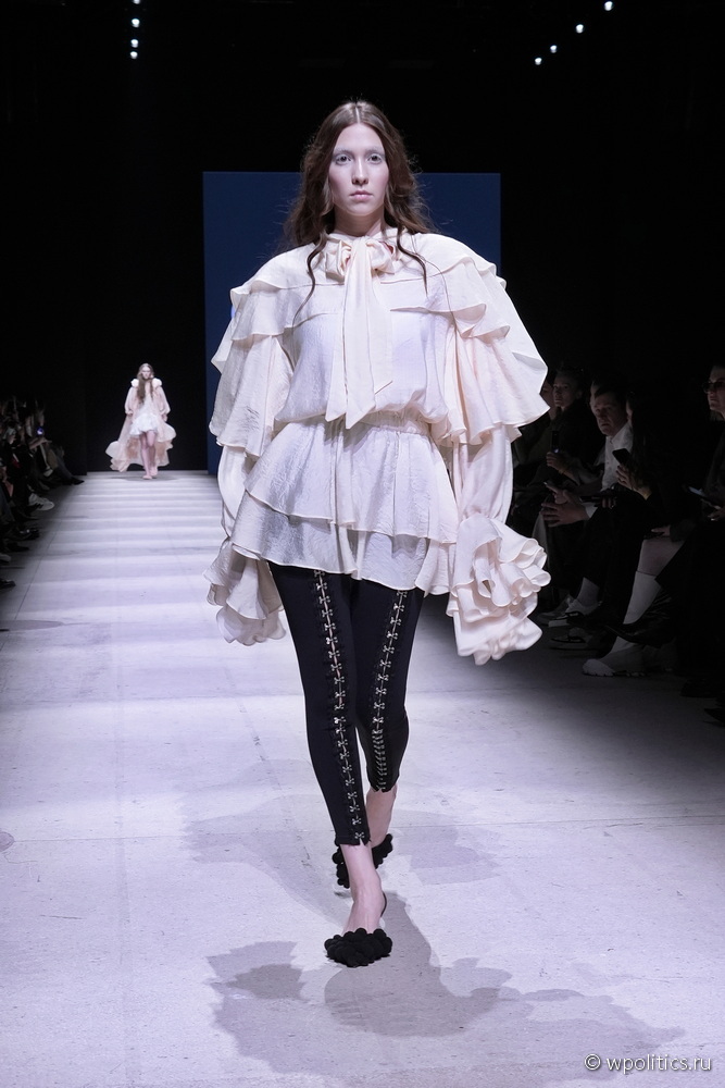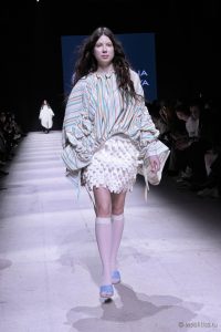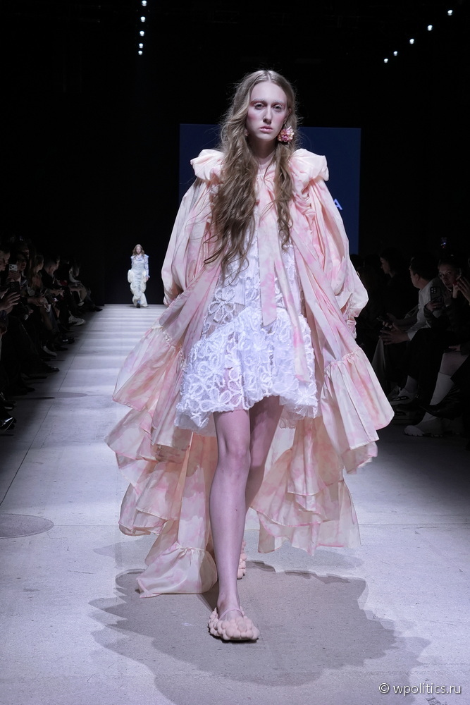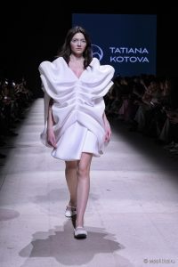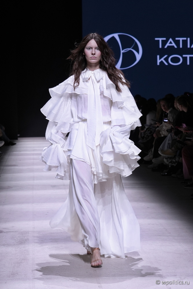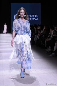 В новой весенней коллекции бренд Tatiana Kotova представил образы, вдохновленные древнегреческим богом западного ветра Зефиром. Палитра состояла из оттенков неба — от утренней дымки до розового заката. Принты, пелерины и ленты отсылали к ретро-футуризму, во времена первых покорителей неба на воздушных шарах. Дополняла образы обувь от официального обувного партнера Московской недели моды O’SHADE.