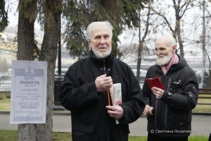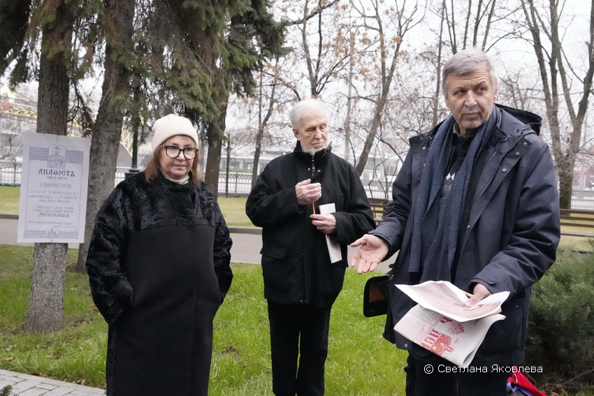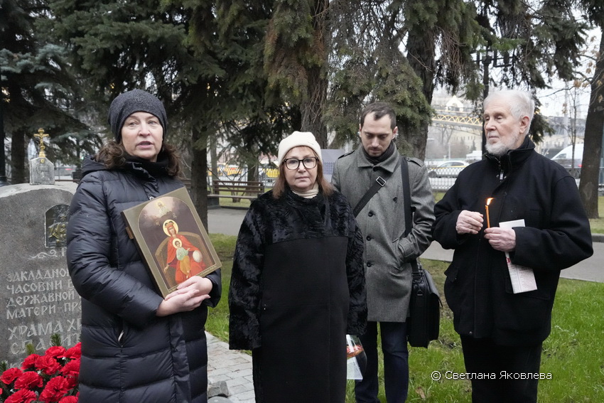 Среди посетивших мероприятие были те, кто в самом начале молились у закладного камня, ходили крестными ходами вокруг бассейна «Москва» — это писатель В.Н. Крупин, главный редактор газеты «Русь Державная» А.Н. Печерский, С.В. Макроусов.
