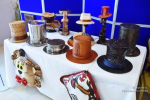 В коллекции представлена серия «чудных» головных уборов: кожаный цилиндр и фетровый цилиндр, оформленный оригинальным рисунком, цилиндр кованый (металлический) и керамические (фарфоровые) цилиндры, подборка головных уборов из «нержавейки», плетеные из лозы и бересты канотье и цилиндр, шляпа из дерева, бейсболка из бересты, шлемы, короны и другие уникальные образцы.