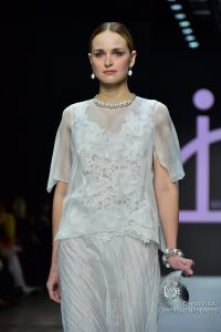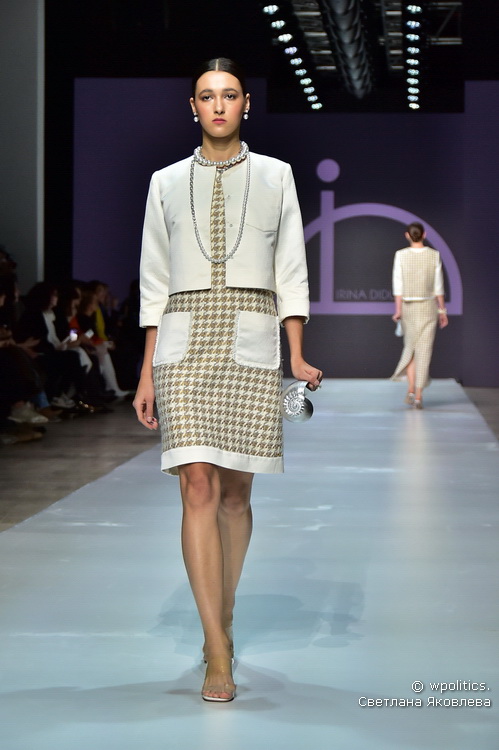 Московский бренд ID IRINA DIDUSHENKO показал на подиуме коллекцию платьев для особого случая. Большинство выходов можно было трактовать как свадебные, однако лаконичность и элегантность белоснежных брючных комплектов, богемных рубашек из жатого шелка, кружевных топов в сочетании с летящими юбками-макси и юбок с объемным цветочным декором позволяет представить их и в других торжественных ситуациях. Главным цветом коллекции стал белый. Образы дополнялись длинными нитями жемчуга, жемчужными обручами для волос и серебристыми аксессуарами в виде морских раковин.